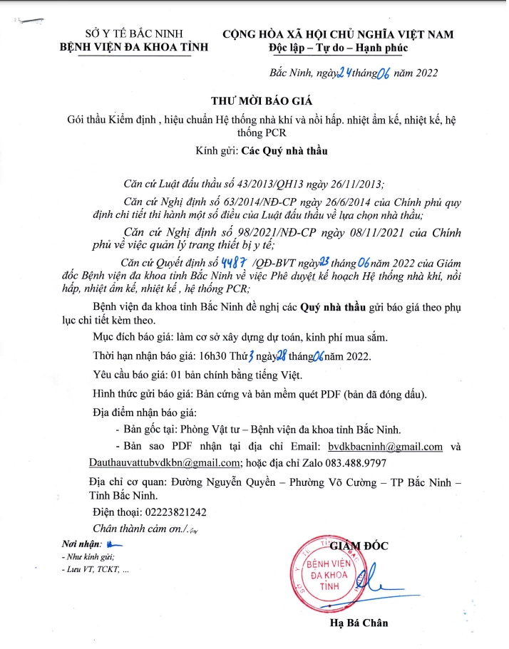 THƯ MỜI BÁO GIÁ GÓI THẦU KIỂM ĐỊNH, HIỆU CHUẨN HỆ THỐNG NHÀ KHÍ VÀ NỒI HẤP, NHIỆT ẨM KẾ, NHIỆT KẾ, HỆ THỐNG PCR
