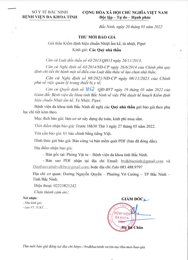Thư mời báo giá Gói thầu kiểm định hiệu chuẩn Nhiệt ẩm kế, tủ nhiệt, Pipet
