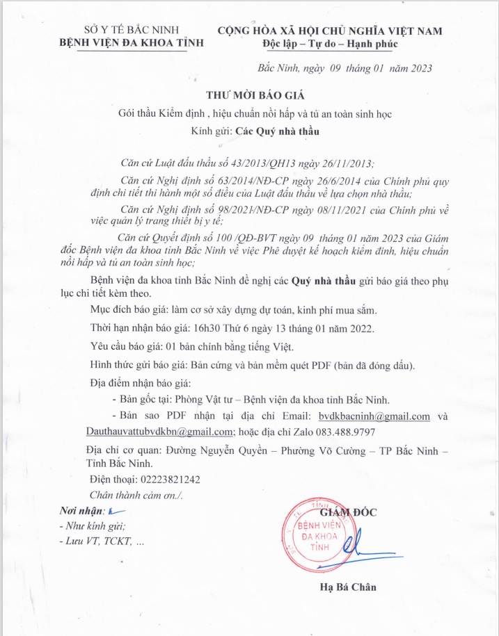 THƯ MỜI BÁO GIÁ Gói thầu Mua sắm hoá chất cho khoa Thận tiết niệu - Lọc máu phục vụ chuyên môn năm 2022-2023