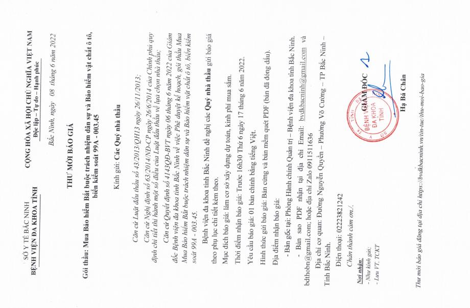 THƯ MỜI BÁO GIÁ: Gói thầu Mua Bảo hiểm Bắt buộc trách nhiệm dân sự và Bảo hiểm vật chất ô tô, biển kiểm soát 99A - 003.45