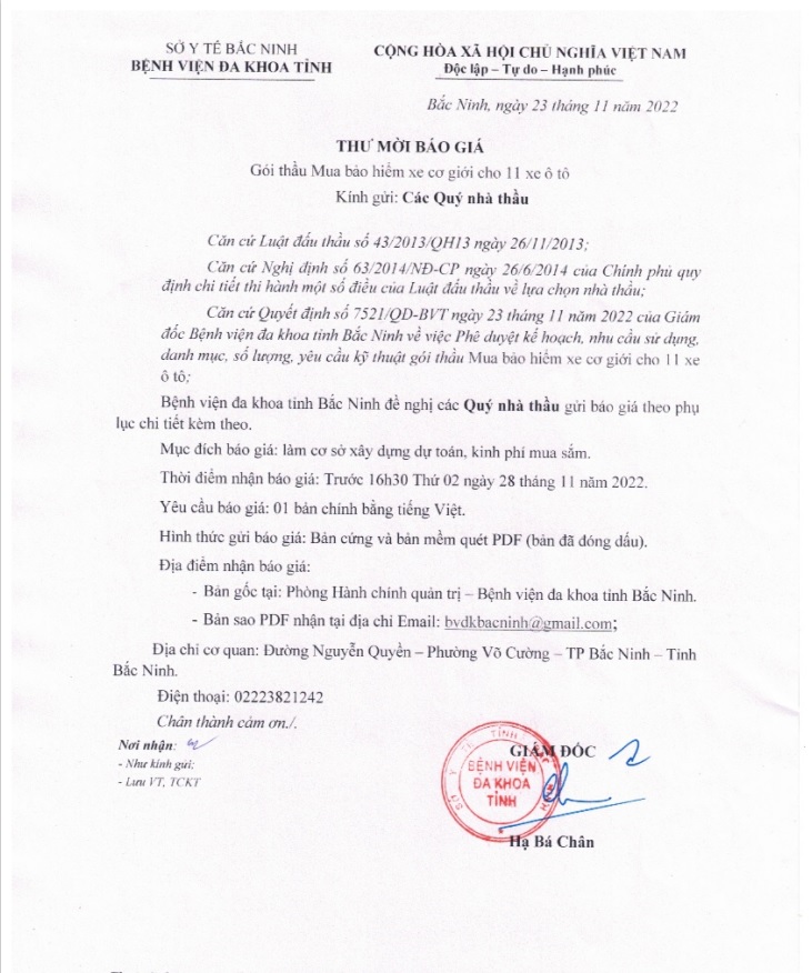 Thư mời báo giá Gói thầu Mua bảo hiểm xe cơ giới cho 11 xe ô tô