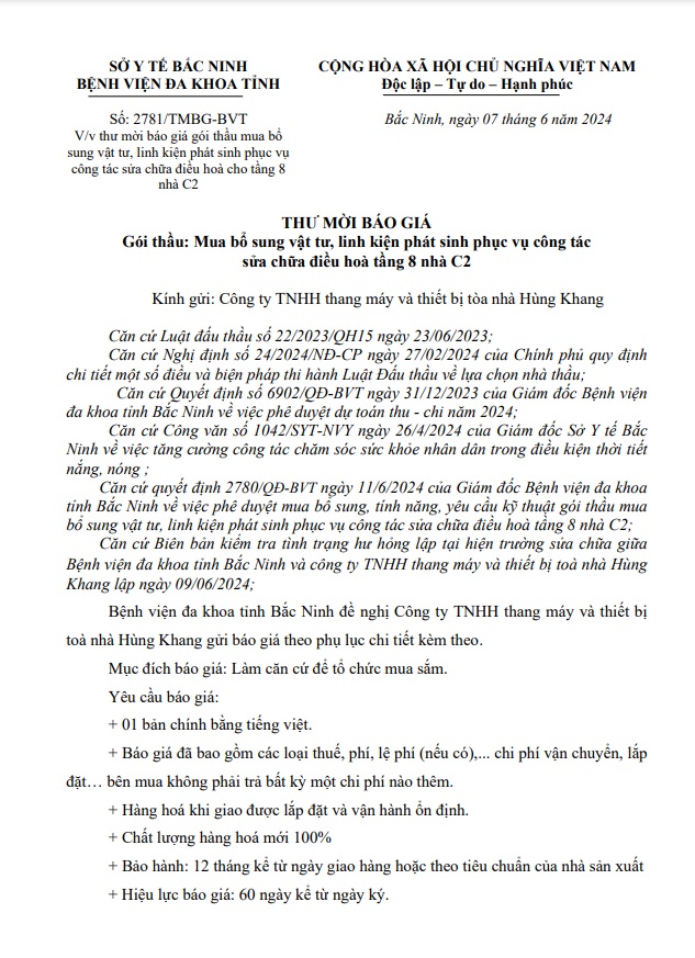 Thư mời báo giá gói thầu mua bổ sung vật tư, linh kiện phát sinh phục vụ công tác sửa chữa điều hoà tầng 8 nhà C2
