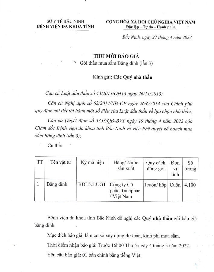 THƯ MỜI BÁO GIÁ GÓI THẦU MUA SẮM BĂNG DÍNH (LẦN 3)