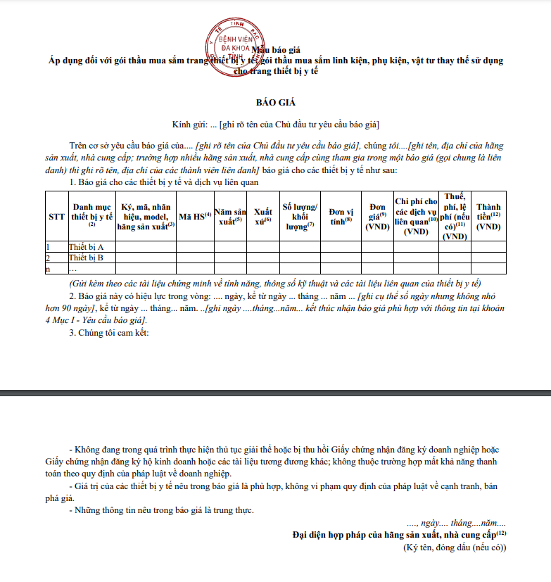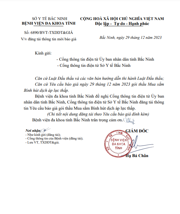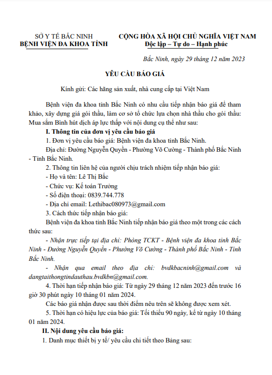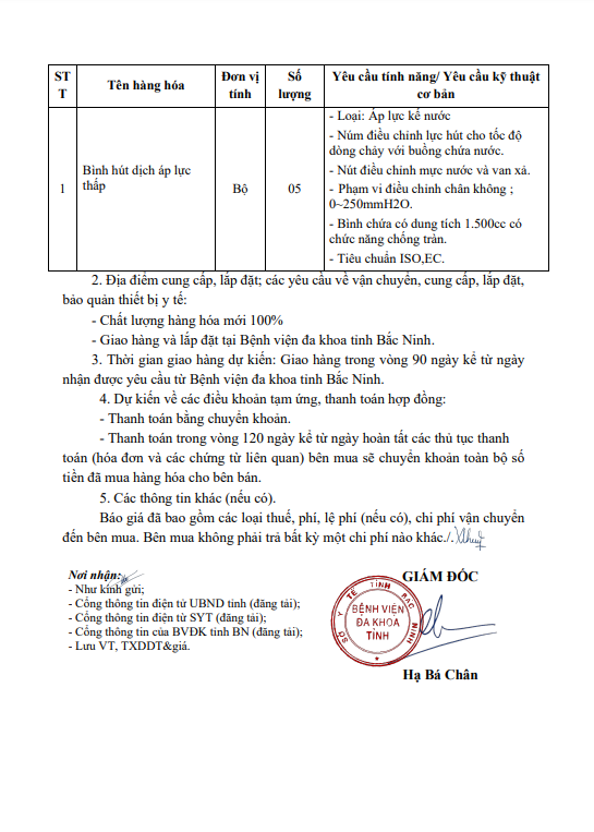Thư mời báo giá gói thầu Mua sắm Bình hút dịch áp lực thấp