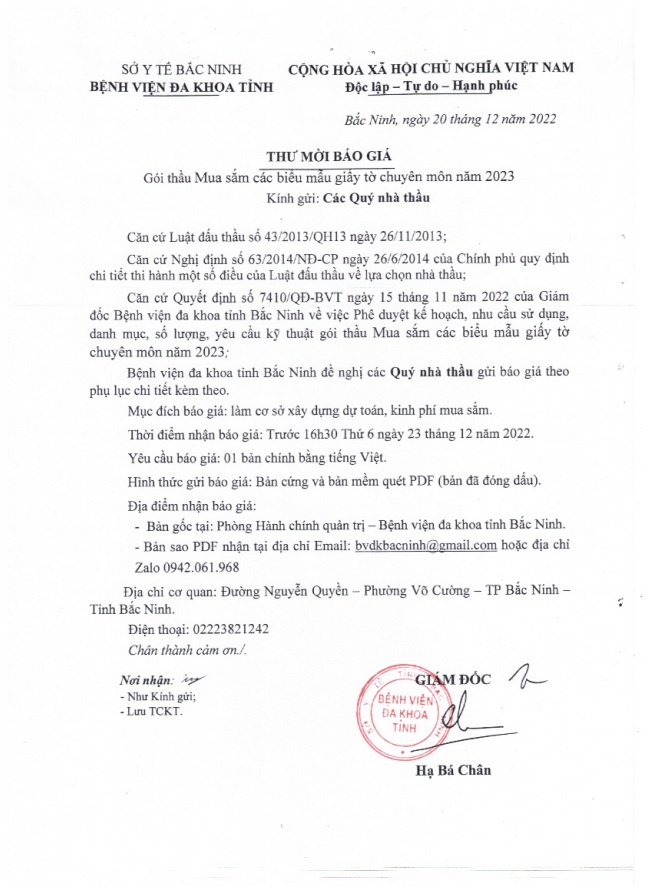 Gia hạn yêu cầu báo giá gói thầu Thuê dịch vụ chứng thực chữ ký số phục vụ ký số tại Bệnh viện đa khoa Bắc Ninh số 2