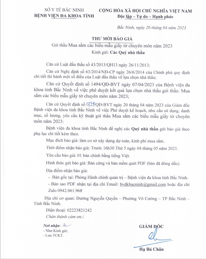 Thư mời báo giá Gói thầu Mua sắm các biểu mẫu giấy tờ chuyên môn năm 2023