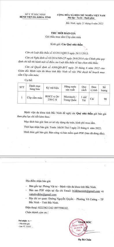 THƯ MỜI BÁO GIÁ GÓI THẦU MUA SẮM CLIP CẦM MÁU