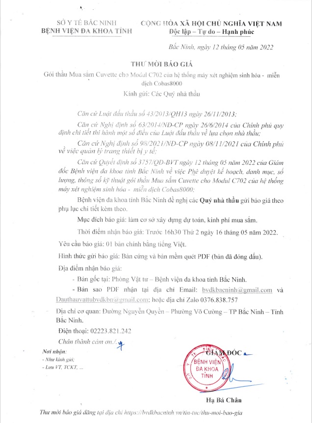 Thư mời báo giá Gói thầu Mua sắm Cuvette cho Mudul C720 của hệ thống máy xét nghiệm sinh hóa - miễn dịch Cobas8000