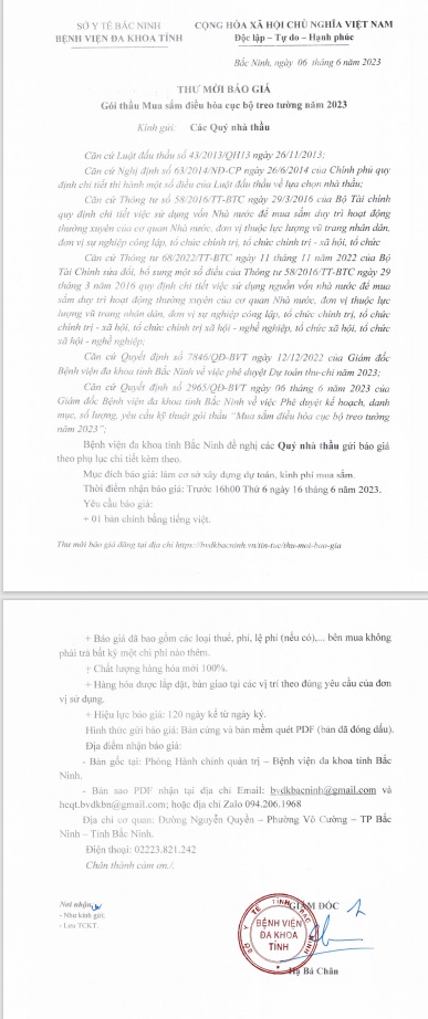 Thư mời báo giá Gói thầu Mua sắm điều hoà cục bộ treo tường năm 2023