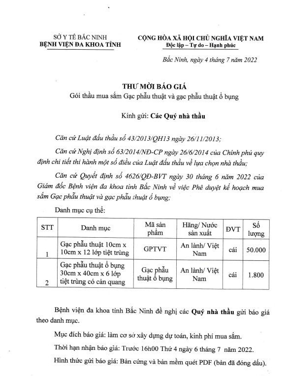 THƯ MỜI BÁO GIÁ: Gói thầu mua sắm Gạc phẫu thuật và gạc phẫu thuật ổ bụng