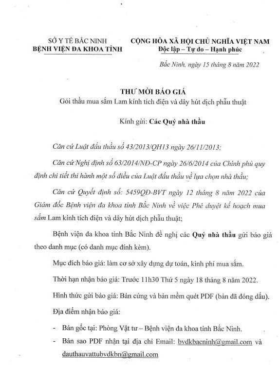 THƯ MỜI BAO GIÁ: GÓI THẦU MUA SẮM LAM KÍNH TÍCH ĐIỆN VÀ DÂY HÚT DỊCH PHẨU THUẬT