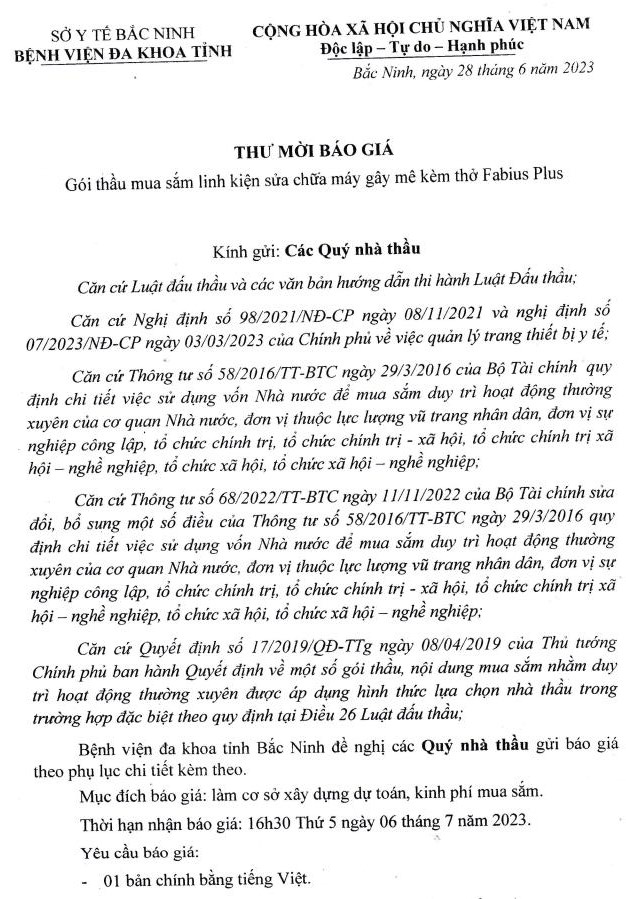 Thư mời báo giá: Gói thầu mua sắm linh kiện sửa chữa máy gây mê kèm thở Fabius Plus