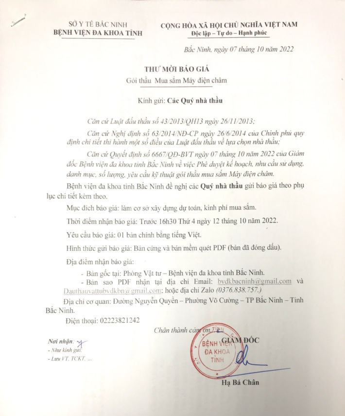 THƯ MỜI BÁO GIÁ Gói thầu Mua sắm Máy điện châm
