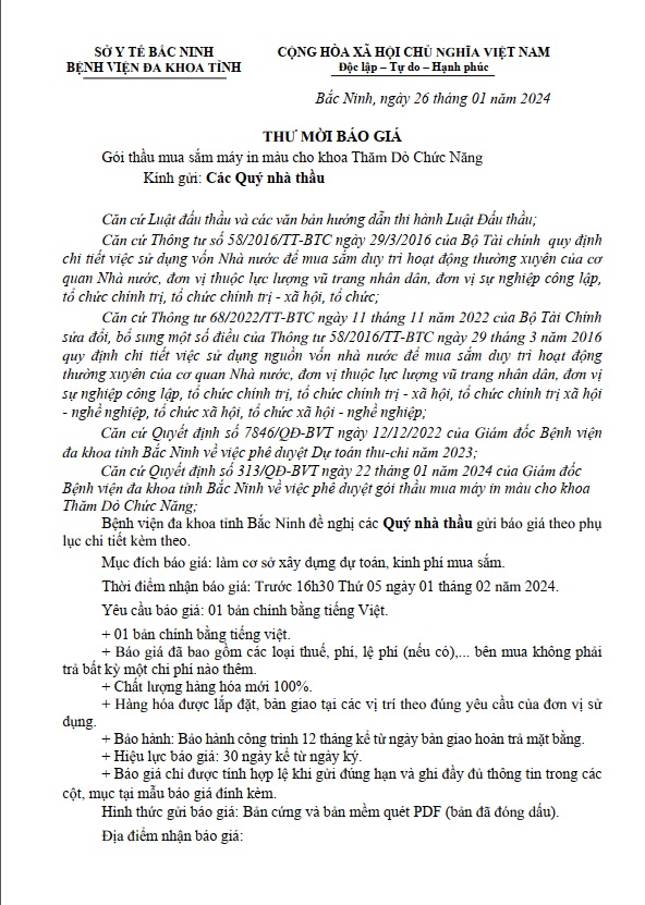 Thư mời báo giá Gói thầu mua sắm máy in màu cho khoa Thăm Dò Chức Năng