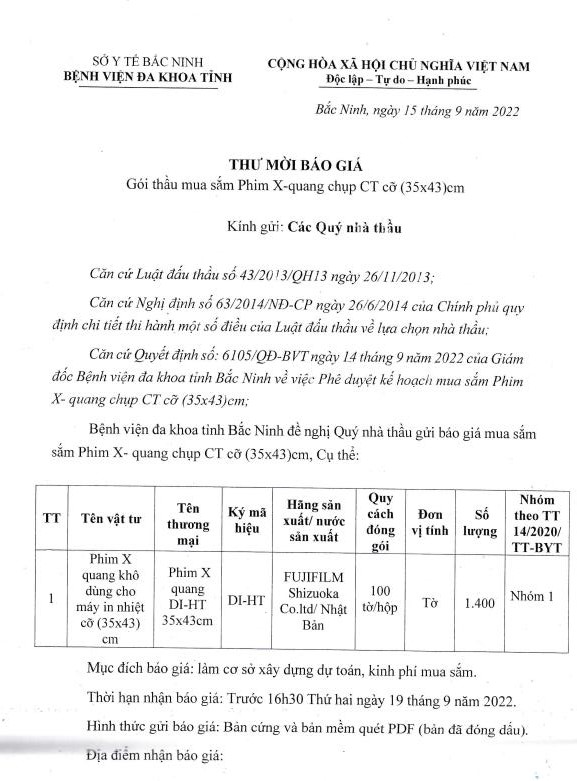 THƯ MỜI BÁO GIÁ: GÓI THẦU MUA SẮM PHIM X - QUANG CHỤP CT CỠ (35 x 43) CM