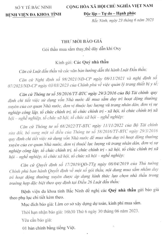 Thư mời báo giá: Gói thầu mua sắm thay thế dây dẫn khí Oxy