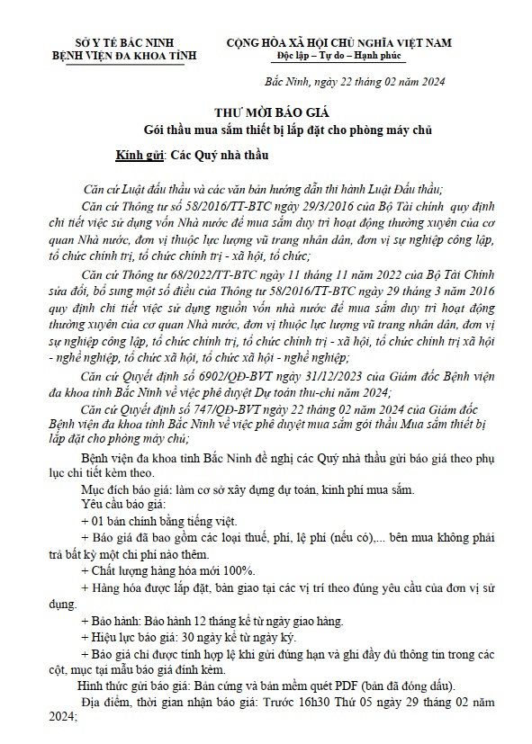 Thư mời báo giá Gói thầu mua sắm thiết bị lắp đặt cho phòng máy chủ