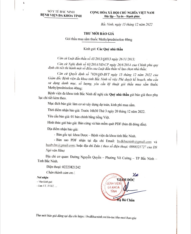Thư mời báo giá Gói thầu mua sắm thuốc Methylprednisolon 40mg