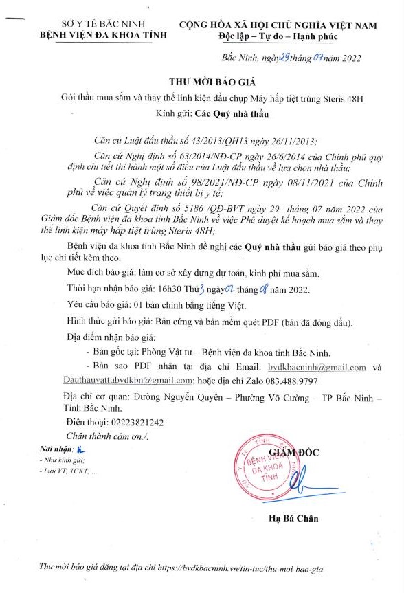 THƯ MỜI BÁO GIÁ: GÓI THẦU MUA SẮM VÀ THAY THẾ LINH KIỆN ĐẦU CHỤP MÁY HẤP TIỆT TRÙNG STERIS 48H