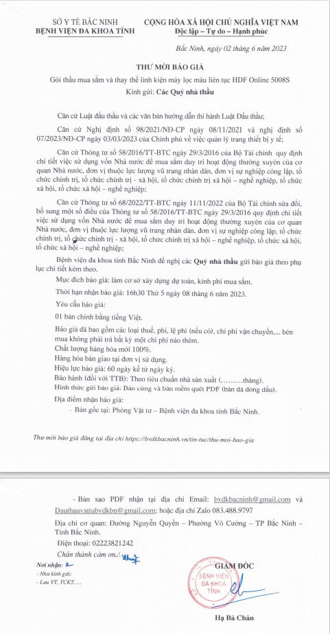 Thư mời báo giá Gói thầu mua sắm và thay thế linh kiện máy lọc máu liên tục HDF Online 5008S