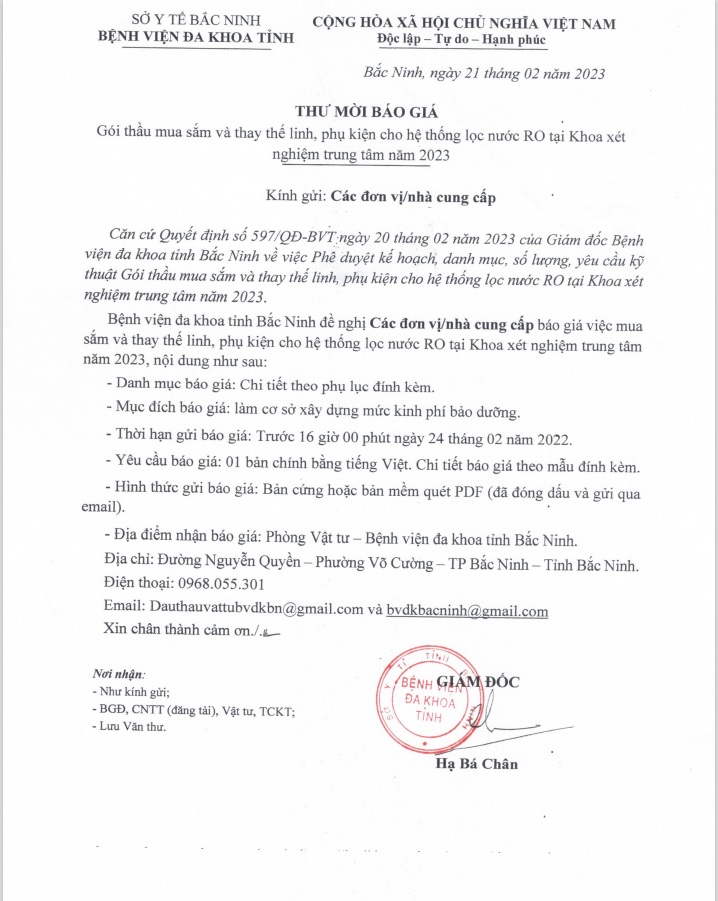 Thư mời báo giá Gói thầu mua sắm và thay thế linh, phụ kiện cho hệ thống lọc nước RO tại khoa xét nghiệm trung tâm năm 2023