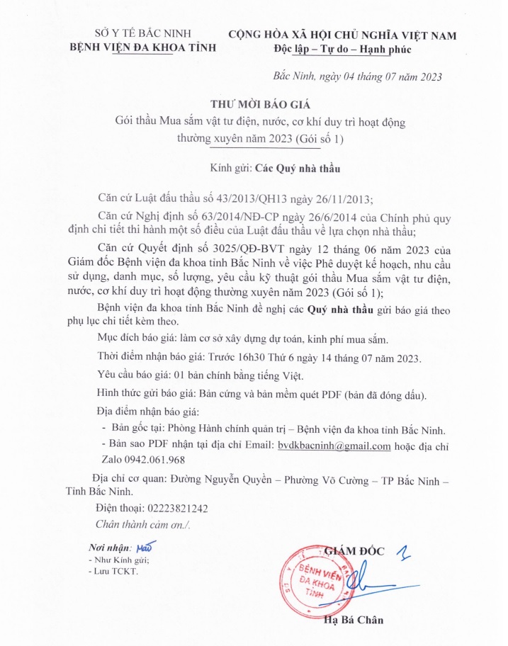 Thư mời báo giá Gói thầu Mua sắm vật tư điện, nước, cơ khí duy trì hoạt động thường xuyên năm 2023 (Gói số 1)