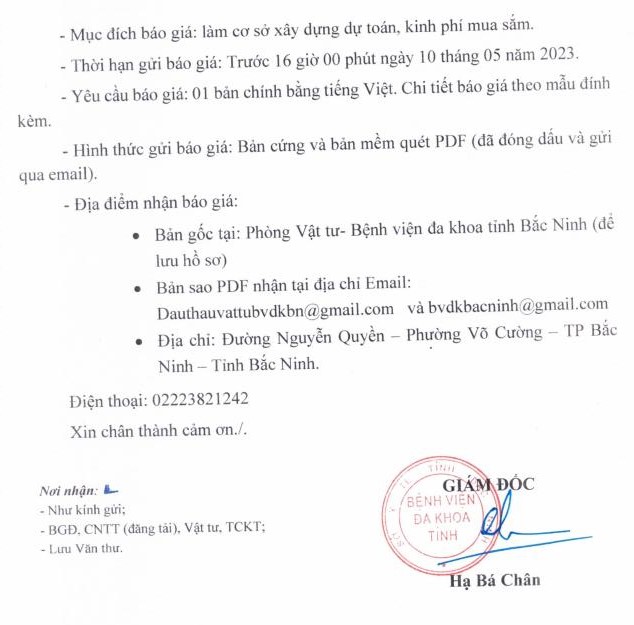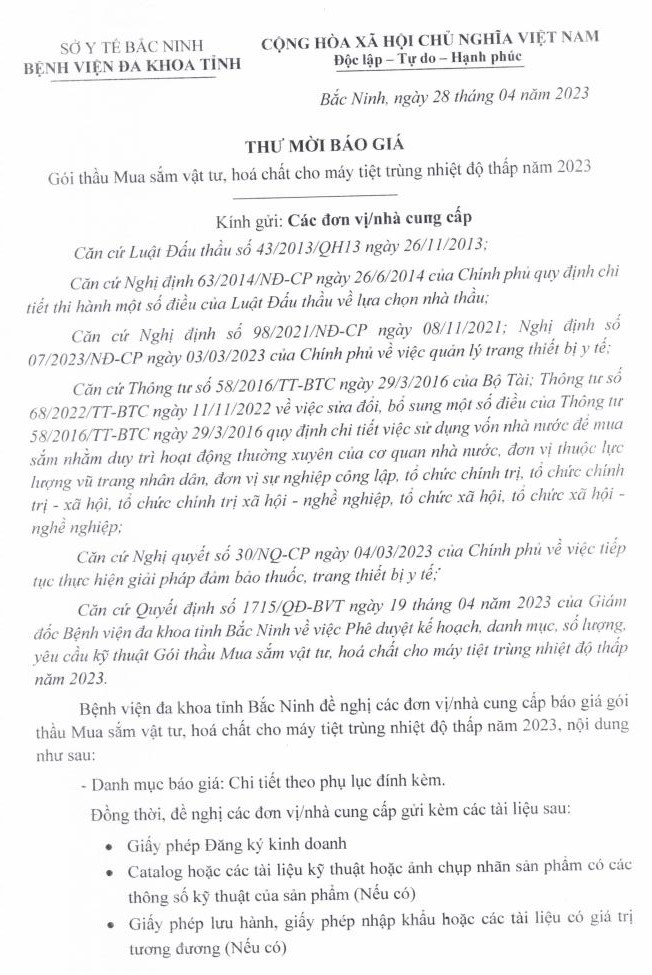 Thư mời báo giá: Gói thầu Mua sắm vật tư, hoá chất cho máy tiệt trùng nhiệt độ thấp năm 2023