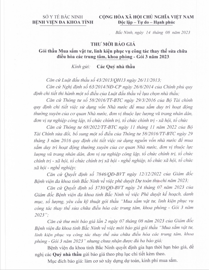Thư mời báo giá Gói thầu Mua sắm vật tư, linh kiện phục vụ công tác thay thế sửa chữa điều hoà các trung tâm, khoa phòng - Gói 2 năm 2023
