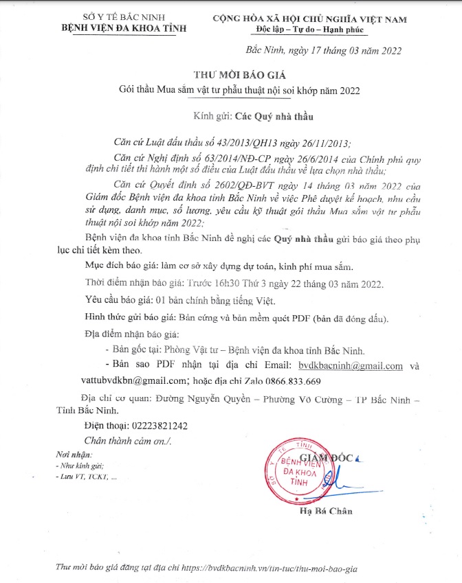 THƯ MỜI BÁO GIÁ Gói thầu mua sắm vật tư phẫu thuật nội soi khớp năm 2022