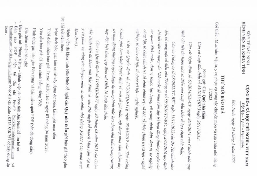 Thư mời báo giá: Gói thầu Mua sắm Vật tư, y cụ phục vụ công tác chuyên môn và sửa chữa nhỏ tháng 3/2023