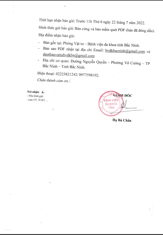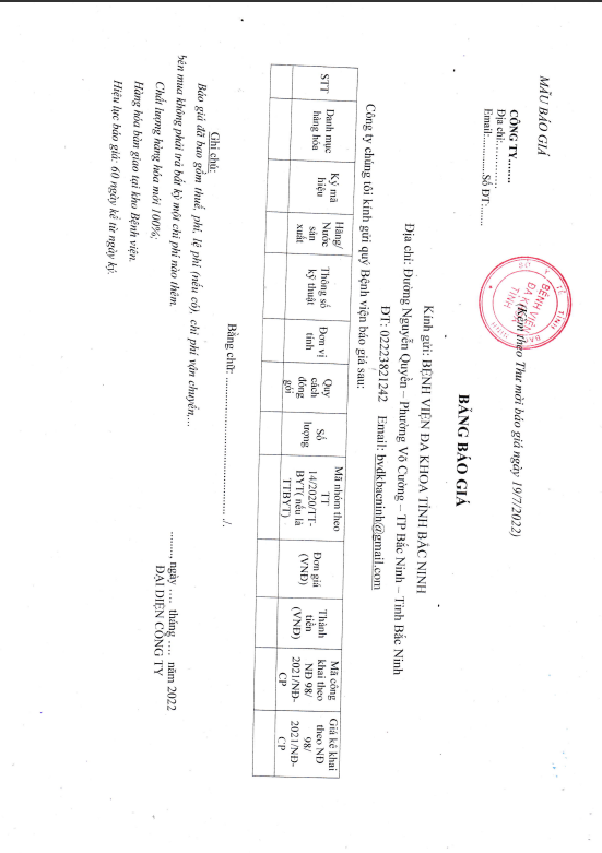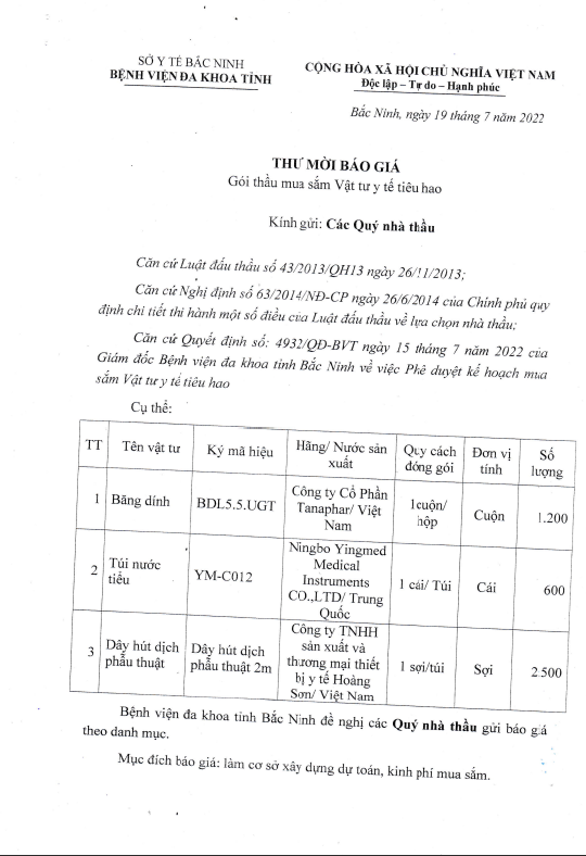 Thư mời báo giá Gói thầu mua sắm Vật tư y tế tiêu hao