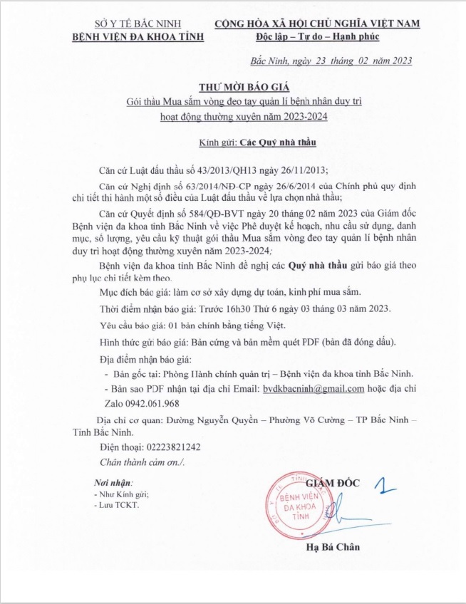 Thư mời báo giá Gói thầu Mua sắm vòng đeo tay quản lý bệnh nhân duy trì hoạt động thường xuyên năm 2023-2024