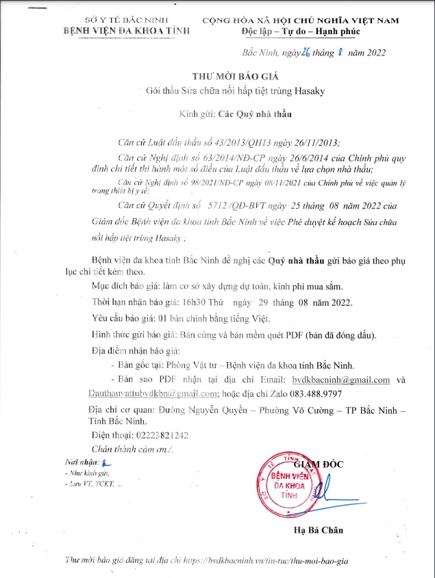 THƯ MỜI BÁO GIÁ Gói thầu Sửa chữa nồi hấp tiệt trùng Hasaky