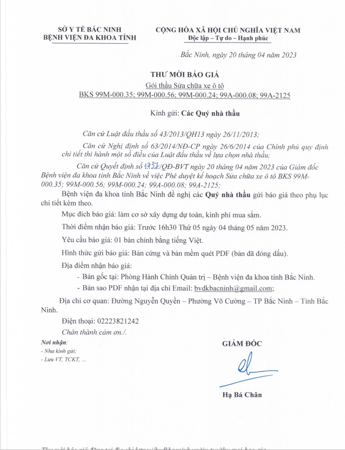Thư mời báo giá Gói thầu Sửa chữa xe ô tô BKS 99M-000.35; 99M-000.56;99M-000.24; 99A-000.08; 99A-2125