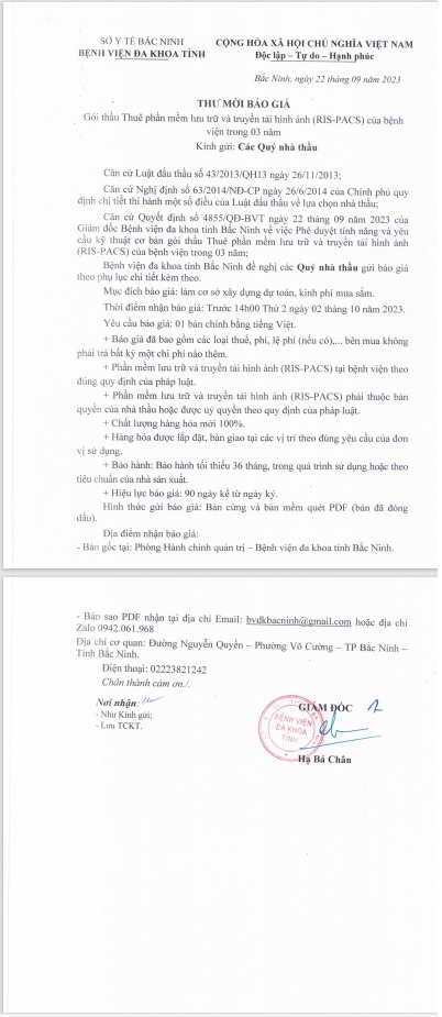 Thư mời báo giá Gói thầu Thuê phần mềm lưu trữ và truyền tải hình ảnh (RIS-PACS) của bệnh viện trong 03 năm