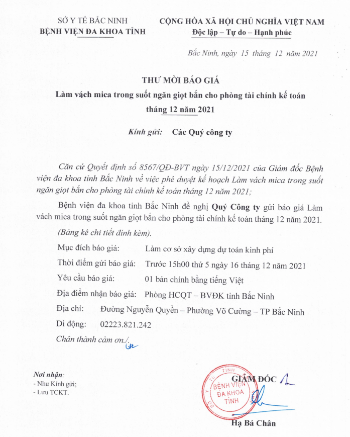 Thư mời báo giá Làm vách mica trong suốt ngăn giọt bắn cho phòng tài chính kế toán tháng 12 năm 2021