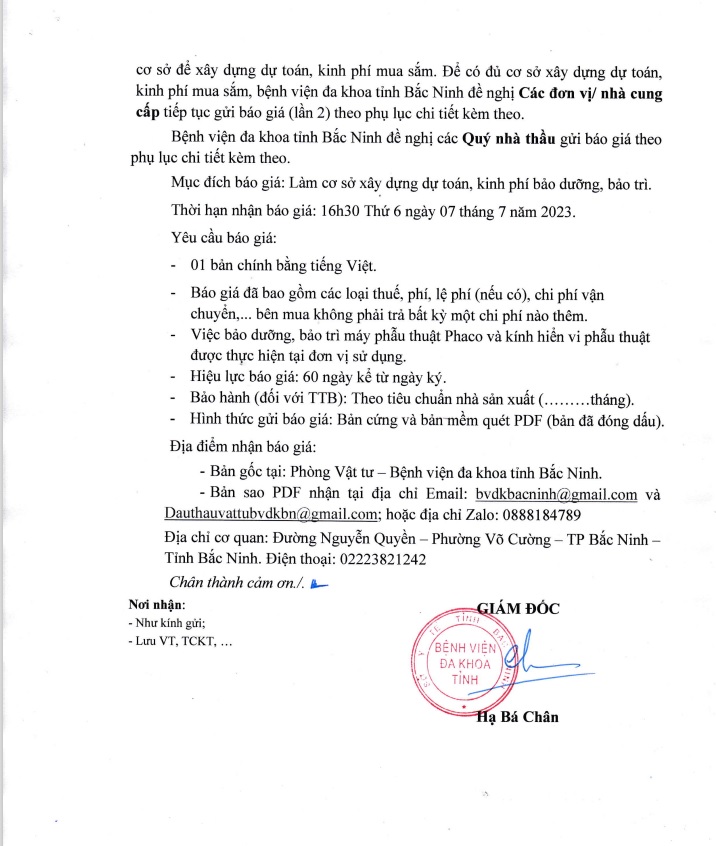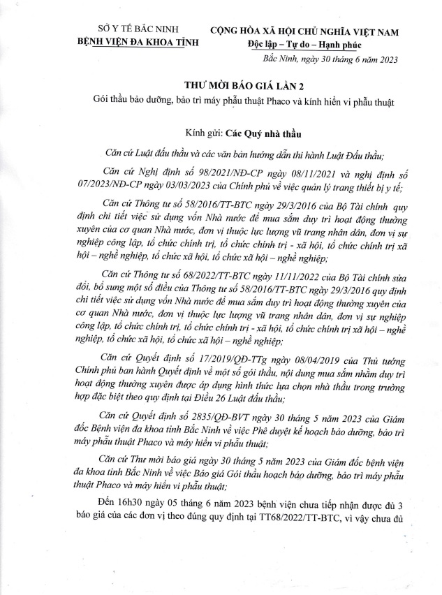Thư mời báo giá lần 2 Gói thầu bảo dưỡng, bảo trì máy phẫu thuật Phaco và kính hiển vi phẫu thuật