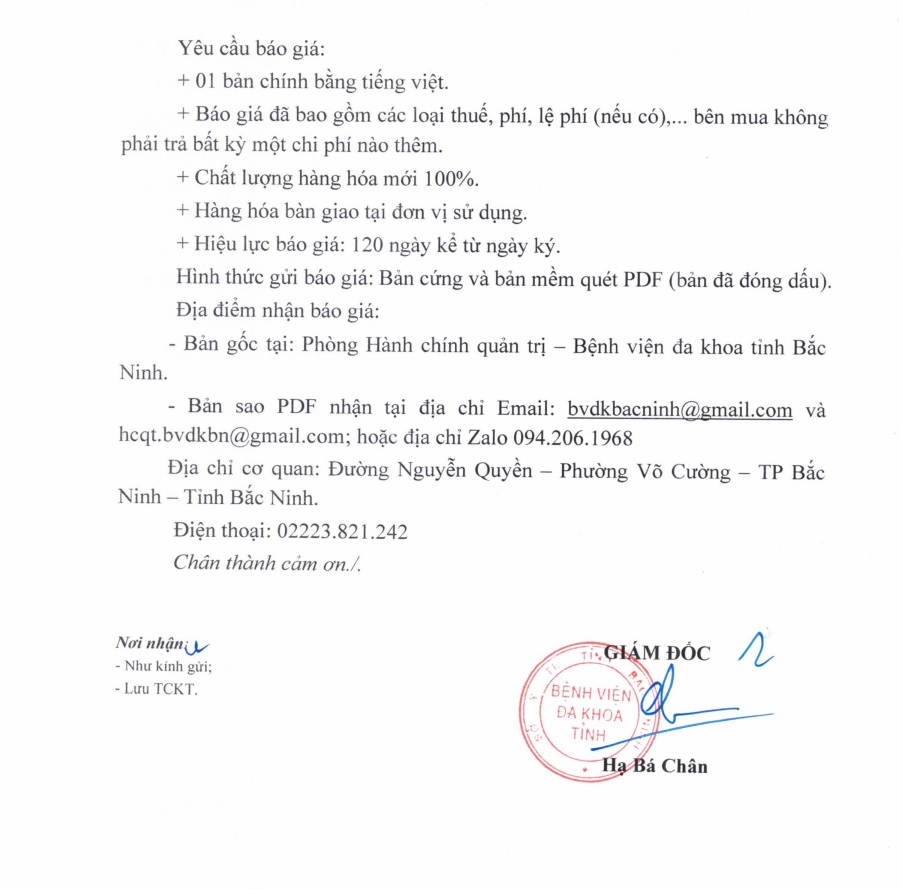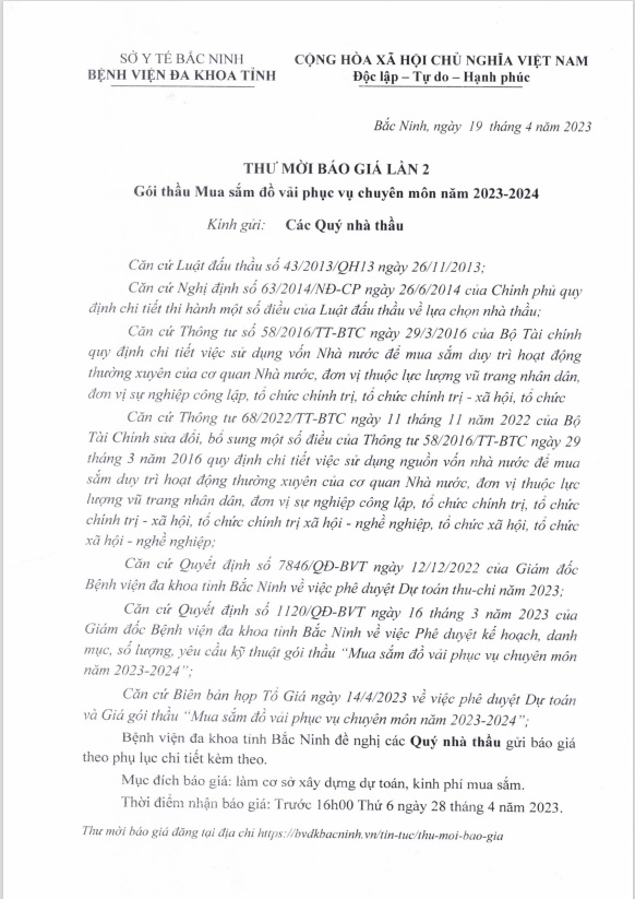 Thư mời báo giá lần 2 Gói thầu Mua sắm đồ vải phục vụ chuyên môn năm 2023-2024