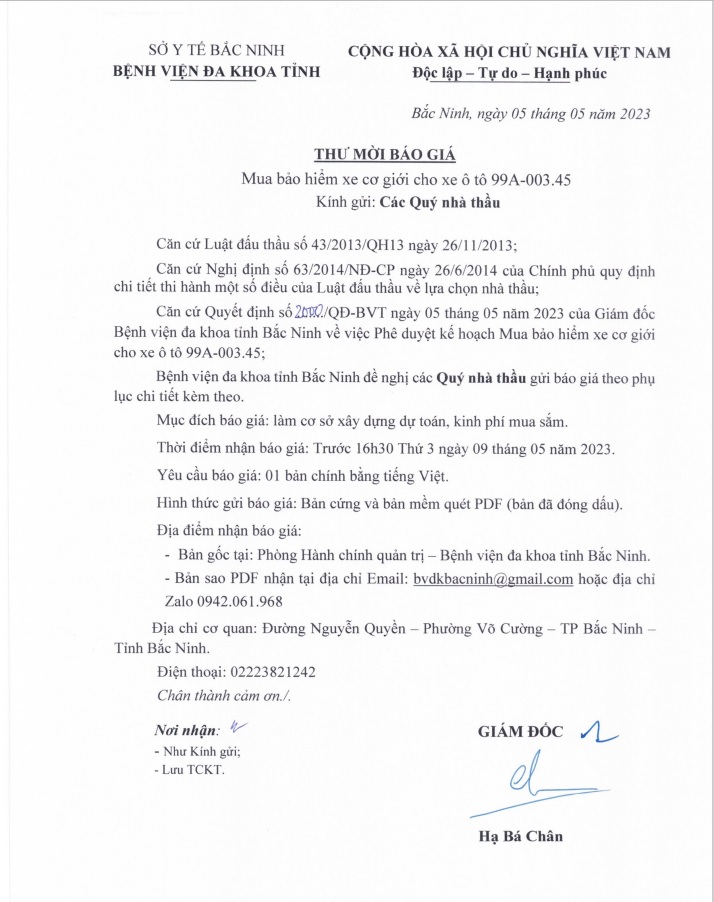 Thư mời báo giá Mua bảo hiểm xe cơ giới cho xe ô tô 99A-003.45