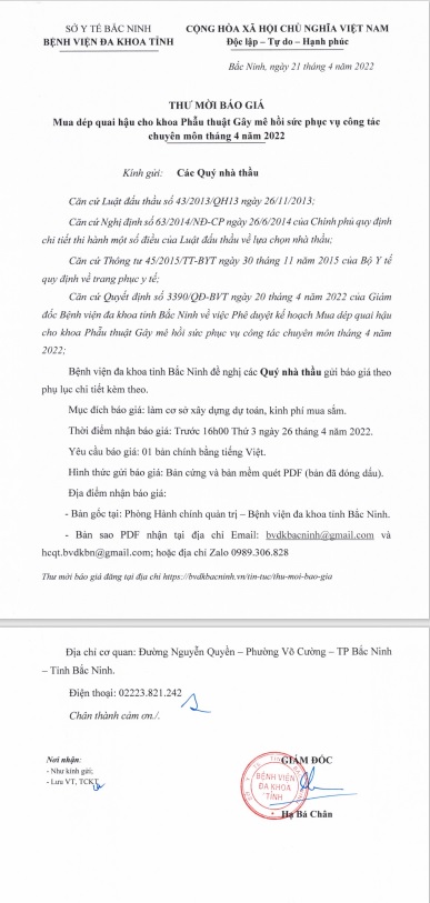 THƯ MỜI BÁO GIÁ Mua dép quai hậu cho khoa Phẫu thuật Gây mê hồi sức phục vụ công tác chuyên môn tháng 4 năm 2022