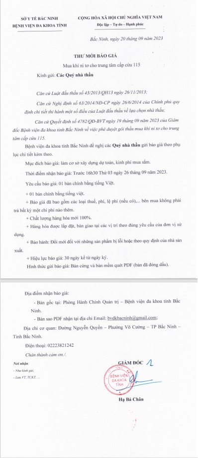 Thư mời báo giá Mua khí ni tơ cho trung tâm cấp cứu 115