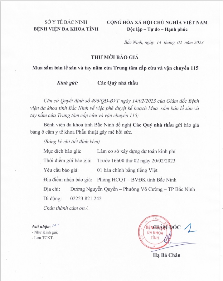 Thư mời báo giá Mua sắm bản lề sàn và tay nắm cửa Trung tâm cấp cứu và vận chuyển 115