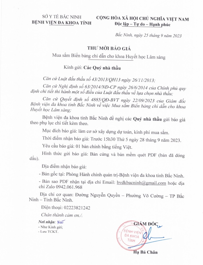 Thư mời báo giá Mua sắm Biển bảng chỉ dẫn cho khoa Huyết học Lâm sàng