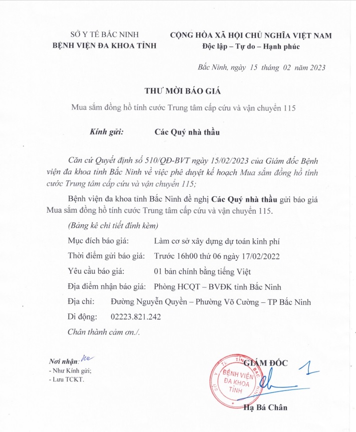 Thư mời báo giá Mua sắm đồng hồ tính cước Trung tâm cấp cứu và vận chuyển 115