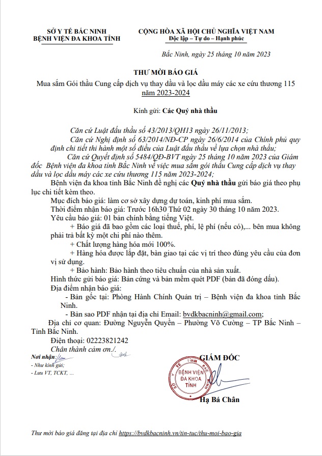 Thư mời báo giá Mua sắm Gói thầu Cung cấp dịch vụ thay dầu và lọc dầu máy các xe cứu thương 115 năm 2023-2024