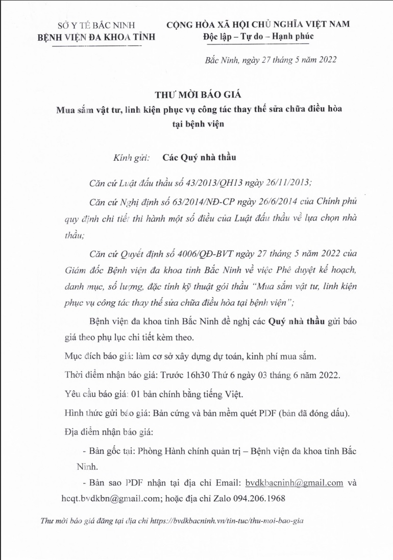 THƯ MỜI BÁO GIÁ: Mua sắm vật tư, linh kiện phục vụ công tác thay thế sửa chữa điều hòa tại bệnh viện