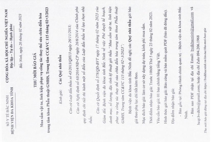 Thư mời báo giá: Mua sắm vật tư, linh kiện phục vụ công tác thay thế sửa chữa điều hòa trung tâm khoa Phẫu thuật GMHS, Trung tâm CC&VC115 tháng 2, 3/2023