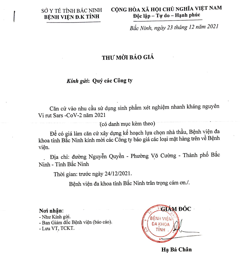 THƯ MỜI BÁO GIÁ SINH PHẨM XÉT NGHIỆM NHANH KHÁNG NGUYÊN VI RUT SARS- COVI-2 NĂM 2021