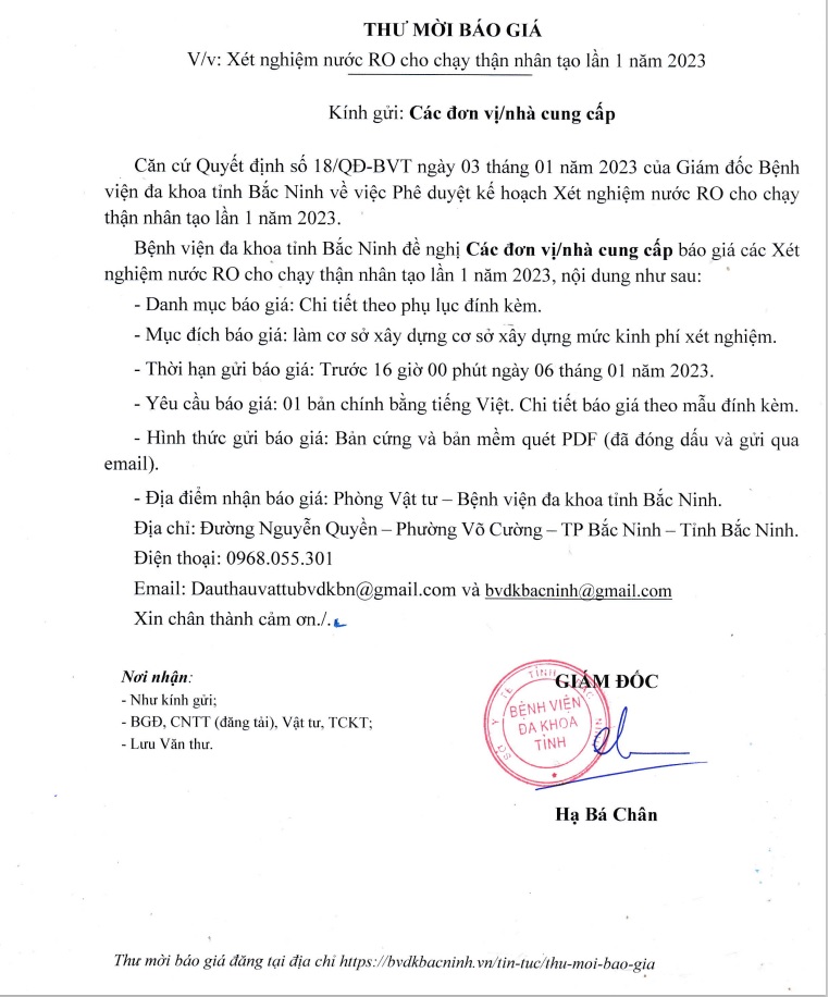 Thư mời báo giá V/v: Xét nghiệm nước RO cho chạy thận nhân tạo lần 1 năm 2023