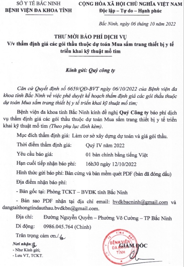 THƯ MỜI BÁO PHÍ DỊCH VỤ V/v thẩm định giá các gói thầu thuộc dự toán Mua sắm trang thiết bị y tế triển khai kỹ thuật mổ tim